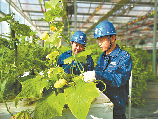 國網(wǎng)河北館陶縣供電公司員工在電氣化黃瓜大棚查看用電設(shè)備。