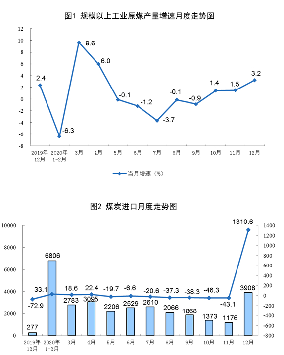 原煤方面。原煤生產(chǎn)有所加快,12月份,生產(chǎn)原煤3.5億噸,同比增長3.2%,增速比上月加快1.7個百分點;日產(chǎn)1135萬噸,環(huán)比減少23萬噸。2020年,生產(chǎn)原煤38.4億噸,比上年增長0.9%。煤炭進口增加,12月份,進口煤炭3908萬噸,環(huán)比增加2732萬噸。2020年,進口煤炭3.04億噸,比上年增長1.5%。