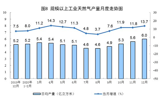 天然氣方面。天然氣生產(chǎn)持續(xù)快速增長。12月份,生產(chǎn)天然氣187億立方米,同比增長13.7%,增速比上月加快1.9個百分點;日產(chǎn)6.0億立方米,環(huán)比增加0.4億立方米。2020年,生產(chǎn)天然氣1888億立方米,比上年增長9.8%,連續(xù)四年增產(chǎn)超過100億立方米。